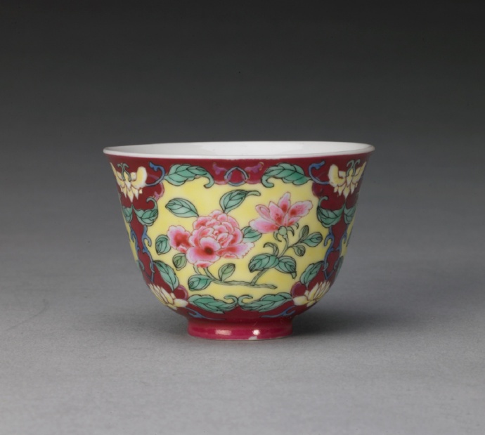 雍正款胭脂紫地粉彩开光月季花纹杯(清雍正,故00151909),通体施胭脂紫釉,色泽柔润雅致,器身开光内绘粉彩月季花,构图精巧、设色清新。杯底署“雍正年制”款,展现雍正时期粉彩瓷器工艺的高超与皇家审美的典雅精致。