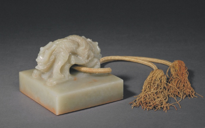 白玉交龙纽“天子之宝”,清乾隆时期御用宝玺,属“乾隆二十五宝”之一。印纽为双龙交缠,雕刻精妙,气势雄浑,寓意皇权至尊。印文“天子之宝”四字篆书布局严谨,刻工深峻有力。整器以上等和田白玉制成,温润凝洁,是清代帝王权威与审美的集中体现,具有极高的历史与艺术价值。