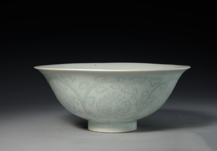 影青釉划花缠枝莲纹碗,明永乐时期瓷器。通体施影青釉,釉色清雅淡雅,碗内壁以划花工艺饰缠枝莲纹,线条流畅细腻。此碗造型规整,工艺精致,延续宋元影青传统,兼具永乐时期瓷器的清丽风格,是明初高质量日用瓷的代表之一。