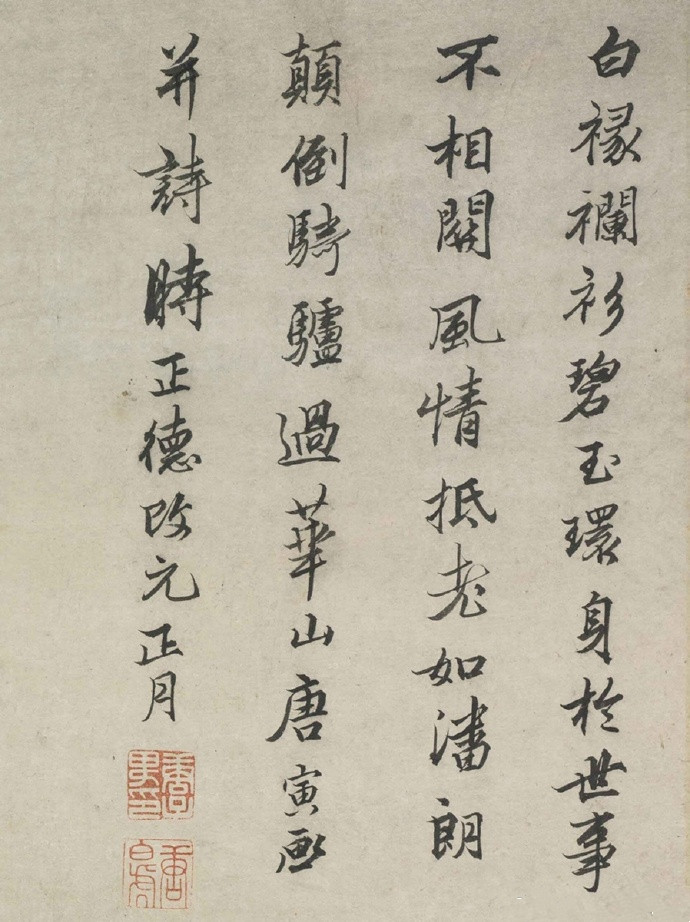 作者题诗一首:“白缘襕袗碧玉环,身于世事玛相关。风情抵老如潘朗,颠倒骑驴过华山。”“唐寅画并诗时正德改元(1506年)正月。”