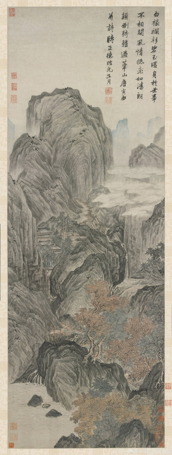 明 唐寅 《华山图》 立轴,纸本,浅设色,116.4×41.4cm,美国克利夫兰艺术博物馆藏。此幅是唐伯虎三十七岁时所作,伯虎一生没去过华山,此画当是想象中之景,表达其想壮游南北的宏愿。笔法上还是用的李唐遗法而加以书写化,画史称其足任李唐偏师,此言不虚。