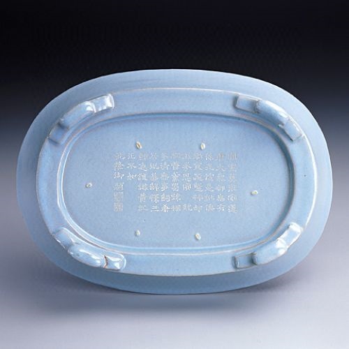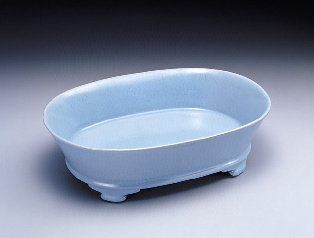 盆高6.7厘米,深3.5厘米,长23厘米,宽16.4厘米,是精品中的精品。汝窑为北宋徽宗朝的官窑,以天青釉色著称于世。汝窑传世作品不多,台北“故宫博物院”藏有约21件,水仙盆盆体简雅大方,由于重复施釉的关系,釉层略具厚度,并带有流动性。口沿处釉层较薄,隐约透出胎土色泽;而四个云头足的转折部分,又有釉层堆积,柔腻如脂。釉层的厚薄,造成全器釉色与质感的细腻变化,扣人心弦。存世汝窑器多有开片,独此件光洁无纹,益发显得匀净端庄,充分展现北宋制瓷工艺对于如玉釉质的无上追求。