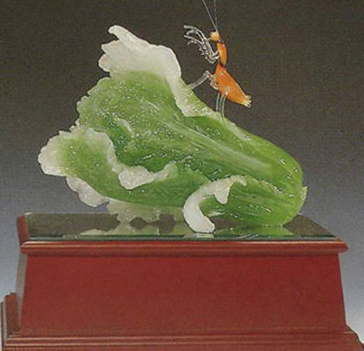 翠玉白菜与真实白菜相似度几乎百分百的作品,是由翠玉所琢碾而成,亲切的题材、洁白的菜身与翠绿的叶子,都让人感觉十分熟悉而亲近,别忘了看看菜叶上停留的两只昆虫,它们可是寓意多子多孙的螽斯和蝗虫。此件作品原置于紫禁城的永和宫,永和宫为光绪皇帝妃子瑾妃的寝宫,因此有人推测此器为瑾妃的嫁妆象征其清白,并企求多子多孙。