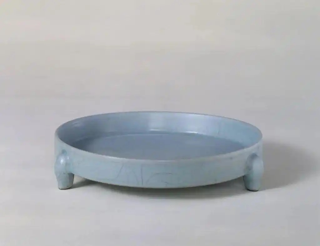 汝窑天青釉三足樽承盘,宋,高4厘米,口径18.5厘米,足距16.9厘米。