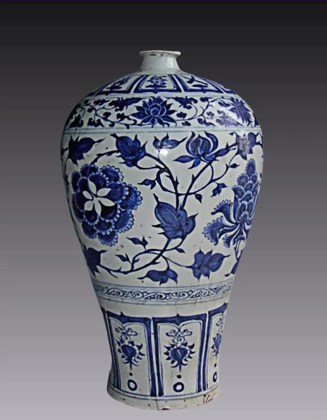这件梅瓶以钴料绘制的青花缠枝牡丹纹饰,色泽浓艳如蓝宝石,笔触流畅如云卷云舒。作为元代青花的经典之作,它不仅展现了景德镇制瓷工艺的革新,更见证了海上丝绸之路的辉煌。其存世稀少,堪称“青花之王”,是理解元代审美与技艺的绝佳窗口。此梅瓶为元代青花巅峰之作,钴料发色幽蓝,牡丹纹饰饱满灵动,是研究元代海上贸易与制瓷技术的核心物证。