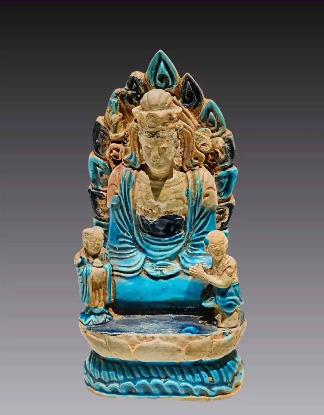 这件瓷雕的工艺源于山西珐华器,以瓷为胎,色彩丰富,透明鲜亮。观音塑像面目慈祥,端坐在莲花座上,善财龙女站立两旁。
