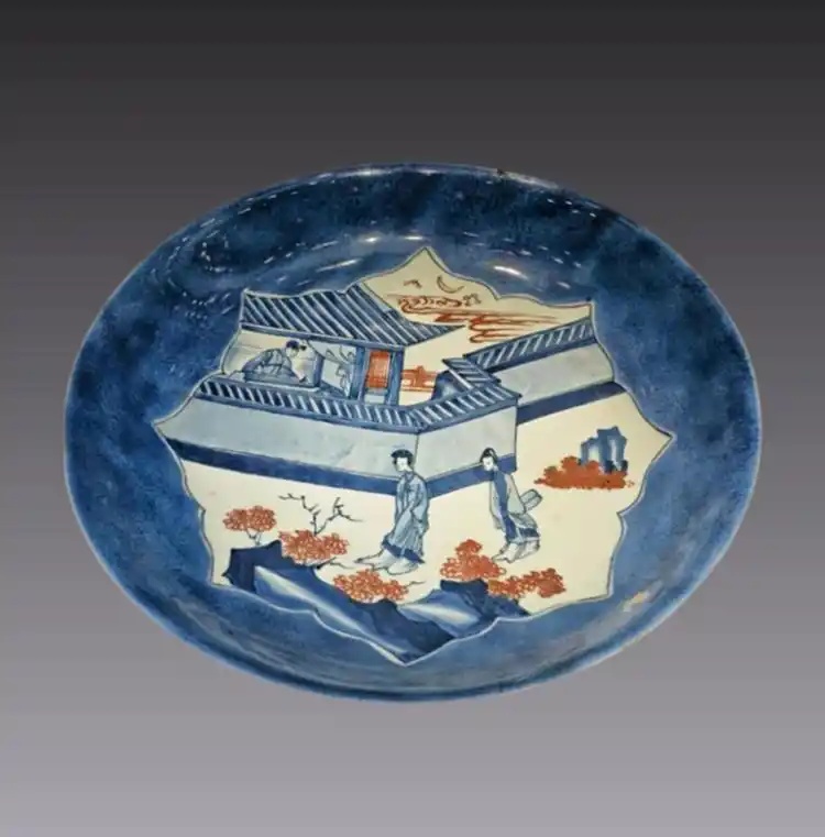 14、洒蓝釉里红西厢记图盘(清代康熙)