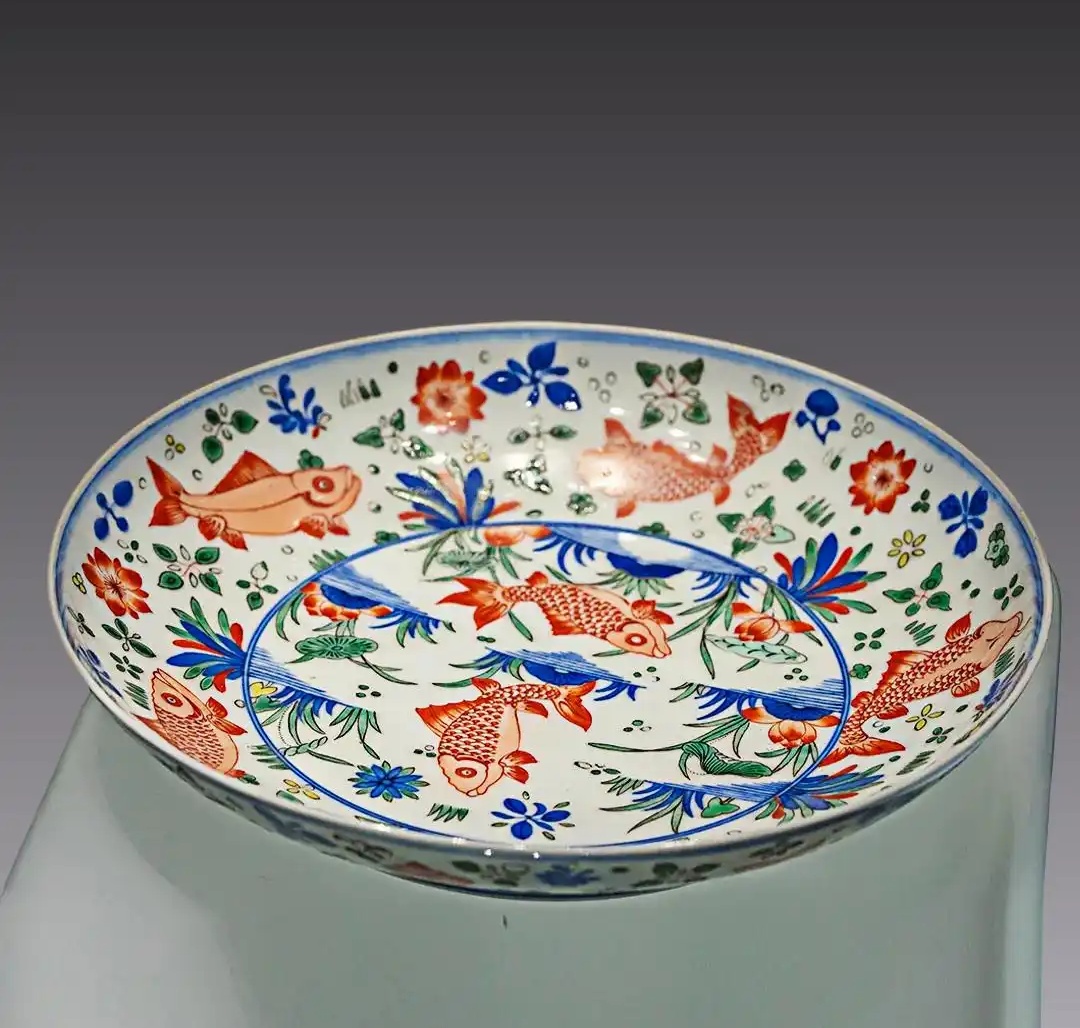 五彩鱼莲瓷器盘整件器物造型规整,胎质坚硬缜密,彩色鲜艳。盘内壁及里心为一幅生动的“鱼乐图”:盘内满绘水藻、浮萍及游动的红鱼;盘外壁所绘水草纹饰与盘内基本相同,水草下面的釉下蓝彩晕染浅淡,似水中倒影,各色深浅不同,层次丰富;盘内、外口沿及近足部位均有青花双圈。