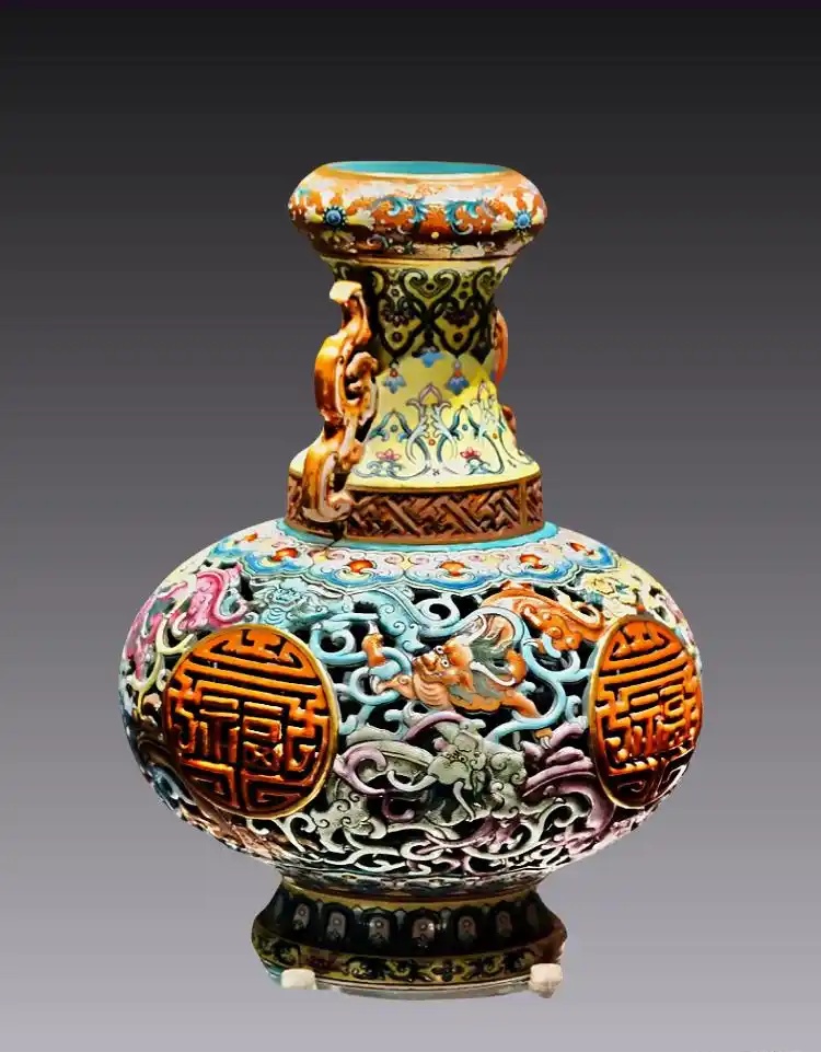 集多种珍贵粉彩于一身,运用高超镂空工艺造就瓷中珍品。瓶身从上至下共有八层纹路,蟠螭纹以盘龙寓意吉祥,福寿纹象征长寿富贵。转心瓶以榫卯结构连接内外双瓶,可通过旋转颈部欣赏内瓶纹饰。