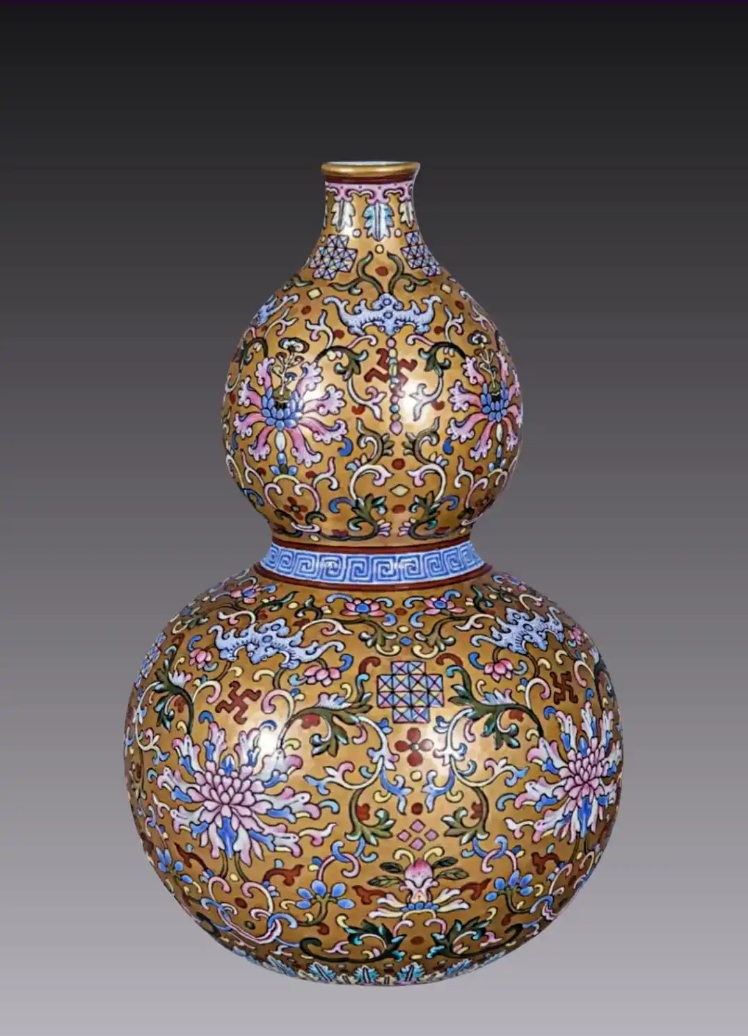 此瓶唇口、束腰、卧足,整体呈葫芦状。腰部饰蓝彩回纹一周,通体以金彩为地。上绘粉彩莲纹,间饰以蝠、卍、桃纹样,近底处绘变形仰莲纹一周。色彩艳丽、构图繁密、瑰丽。圈足内施石绿釉,底款为红彩“大清乾隆年制”篆款。