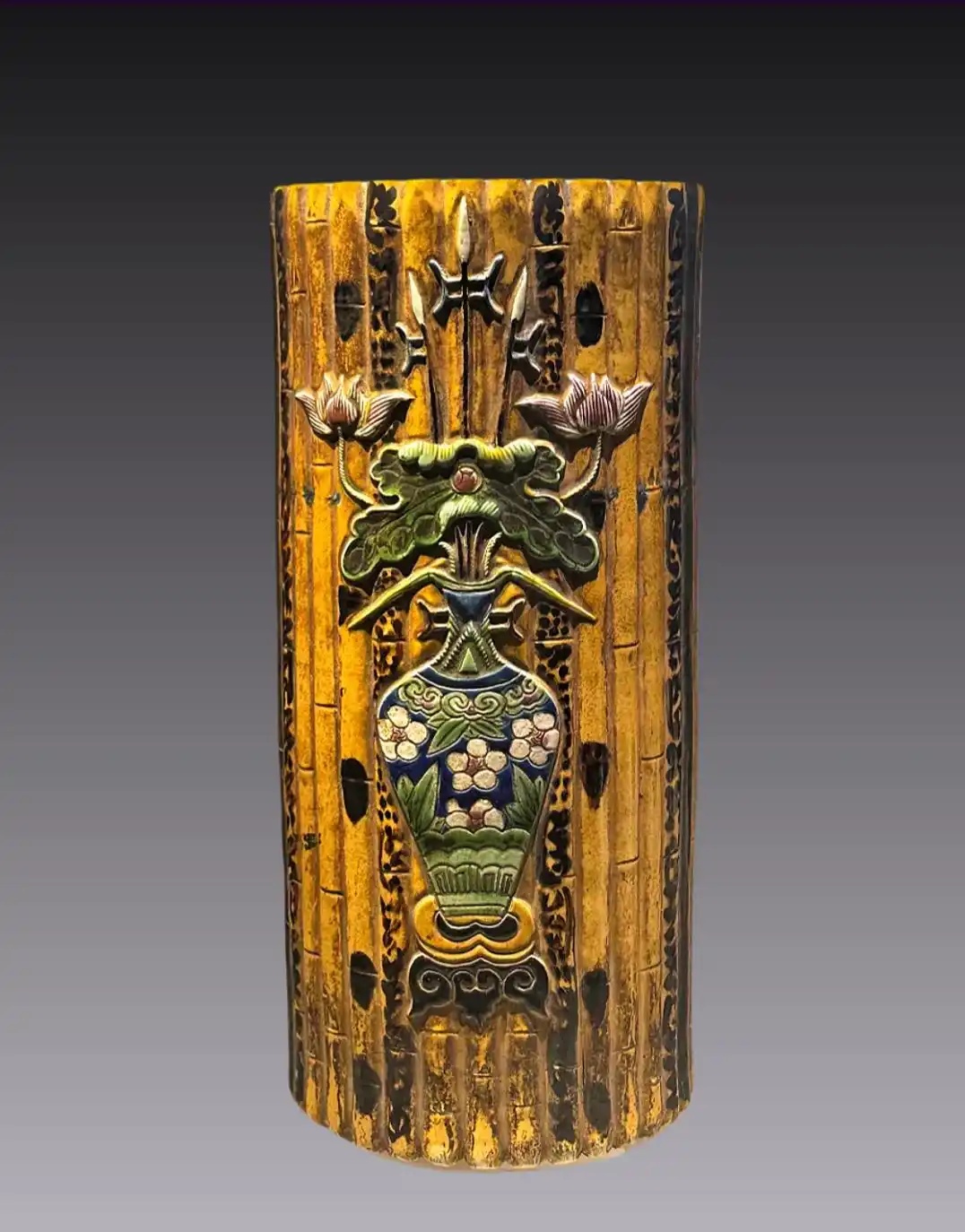 23、黄釉五彩堆雕莲纹竹节帽筒(清代光绪)