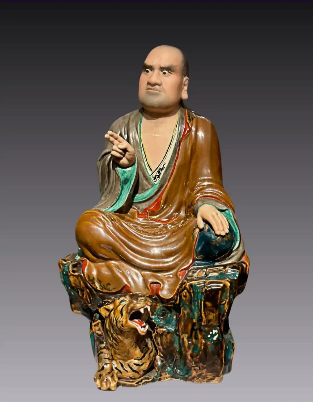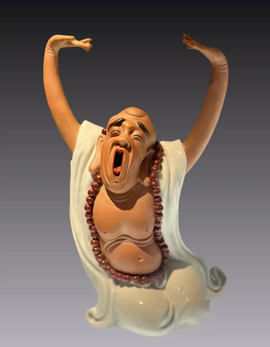 无语菩萨并不是它的真名,也不是一个真正的菩萨。它其实是一件名为“沉思罗汉”的陶瓷雕塑,是中国瓷器美术大师曾龙升的作品,《釉下加彩十八罗汉塑像》中的一件。罗汉是佛教中的一种修行者,有十八位,分别有不同的名字和特征。沉思罗汉是第十一位,他是释迦牟尼佛出家前的儿子,佛法道行在十大弟子中位居首位。他面相丰腴、眉目慈善,于冥想中静悟人所不知。它的大火要归功于网友们的丰富想象力和创造力。