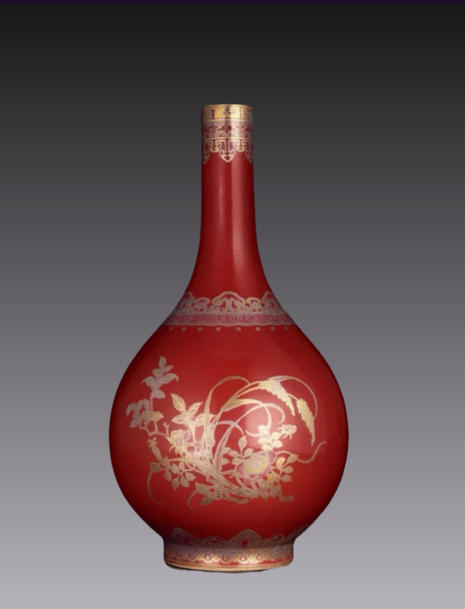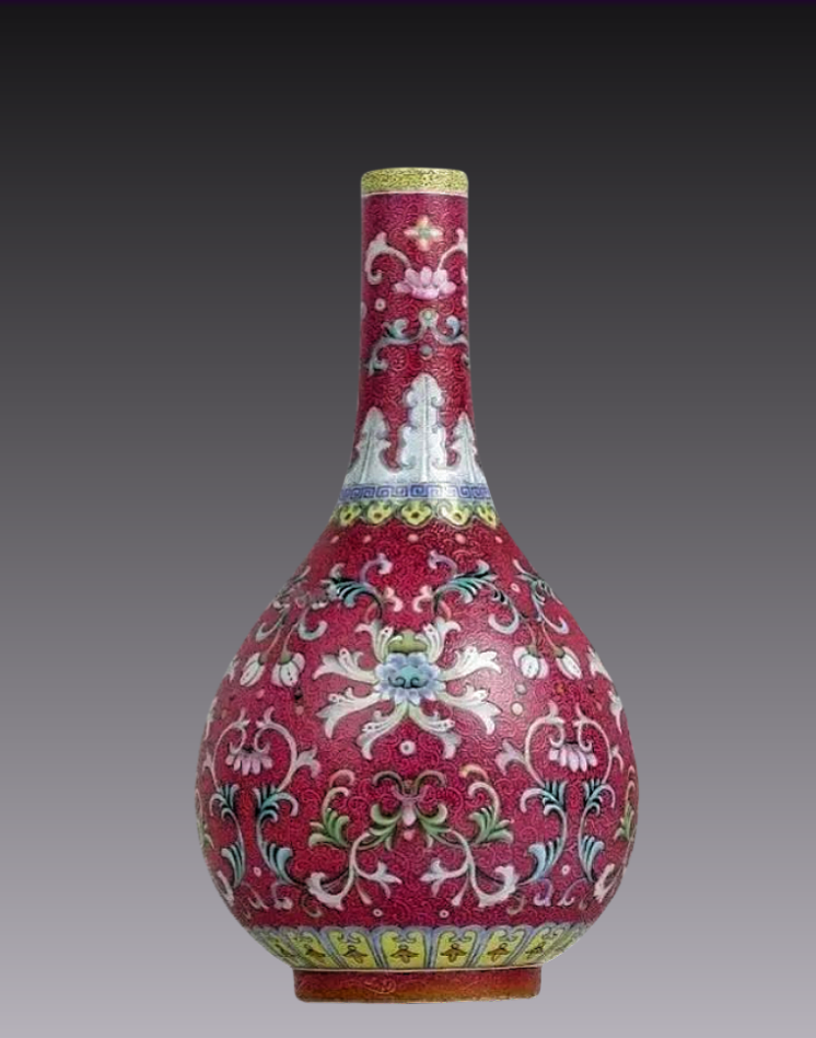 11、清乾隆珐琅彩红地锦上添花胆瓶 台北故宫博物院