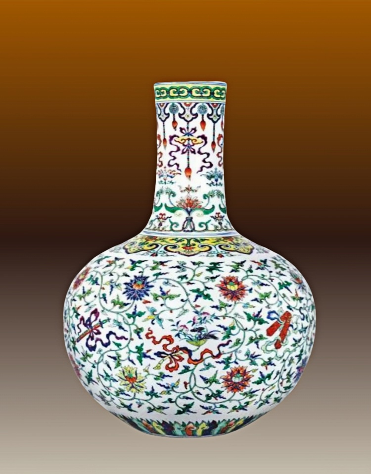 天球瓶是一款非常经典的官窑器型,造型端庄、气势宏伟,备受皇室贵族喜爱。天球瓶也叫“千秋瓶”,有象征“千秋太平”的美好含义。