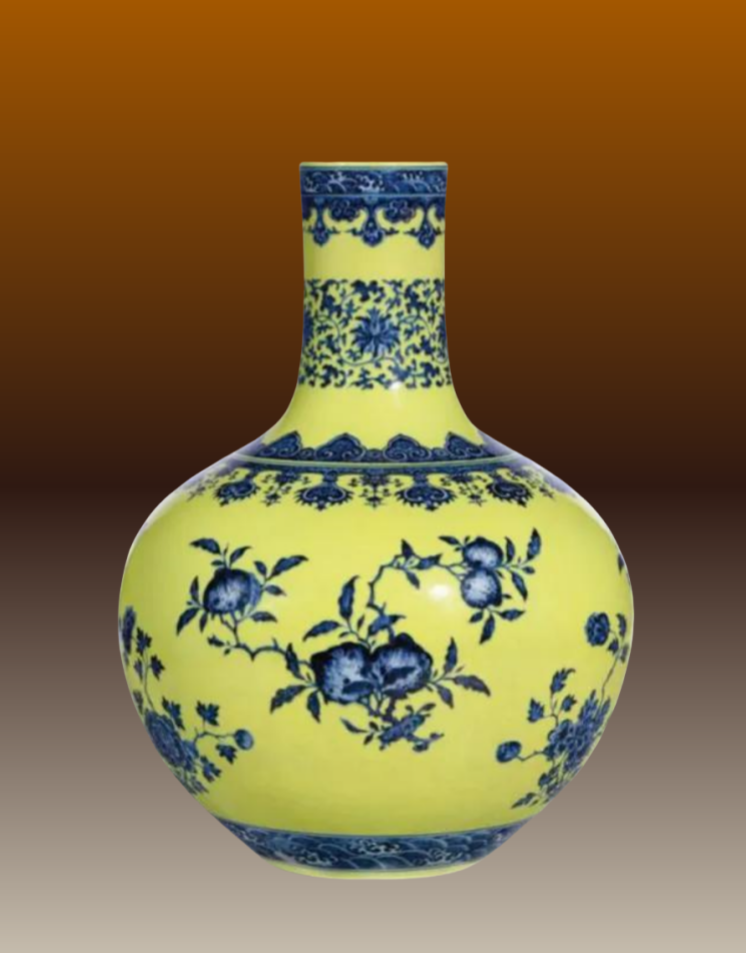 6、历年拍卖第六名 清乾隆 黄地青花折枝花果纹天球瓶
