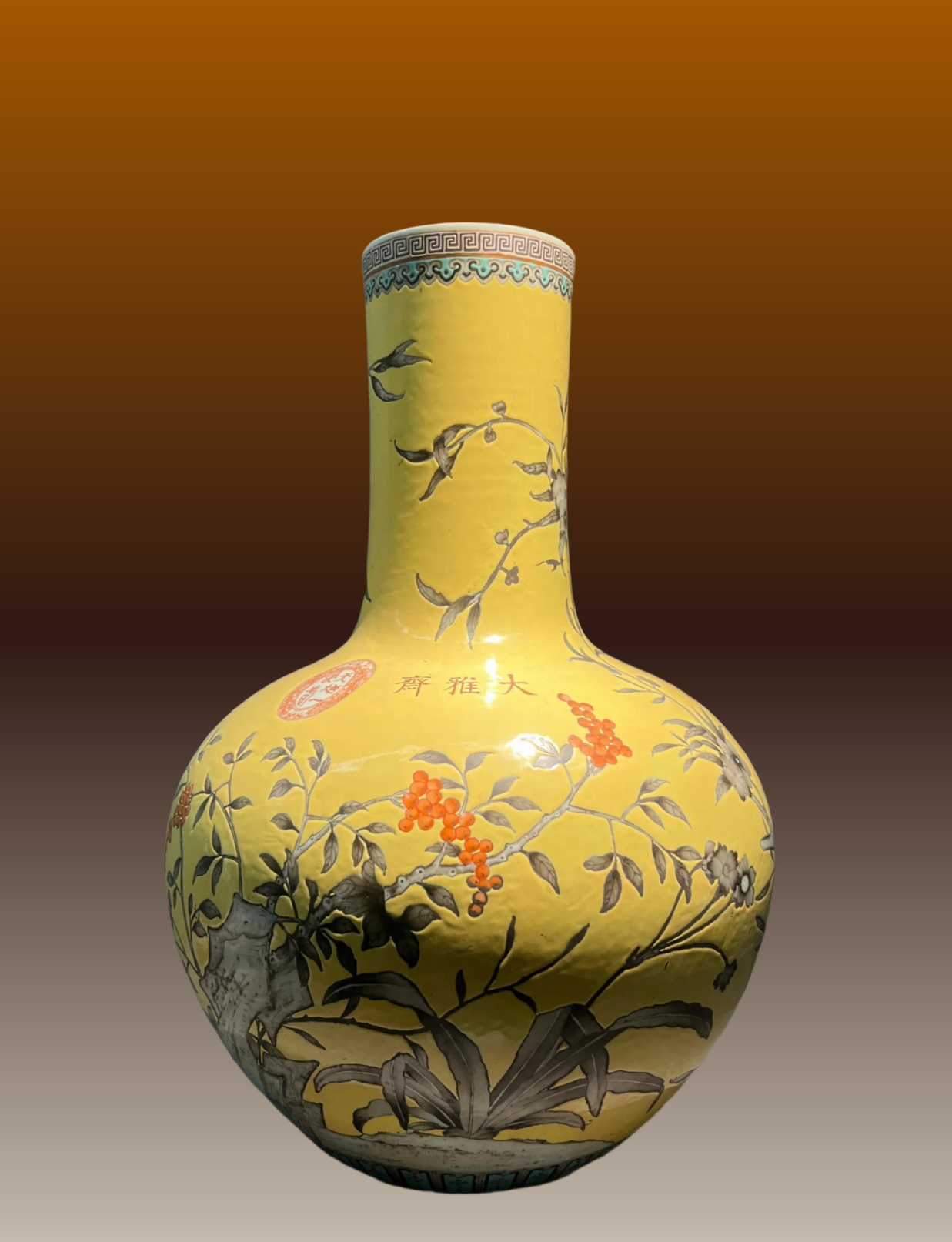 39、清光绪 黄地墨彩花卉纹天球瓶 扬州博物馆