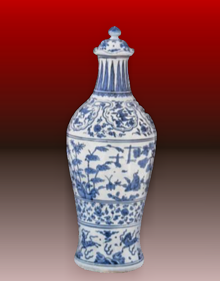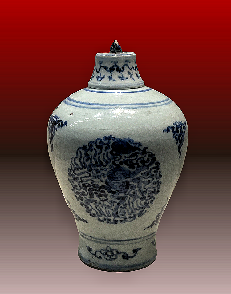 30、镇江博物馆 明嘉靖景德镇窑青花团花狮纹带盖瓷梅瓶