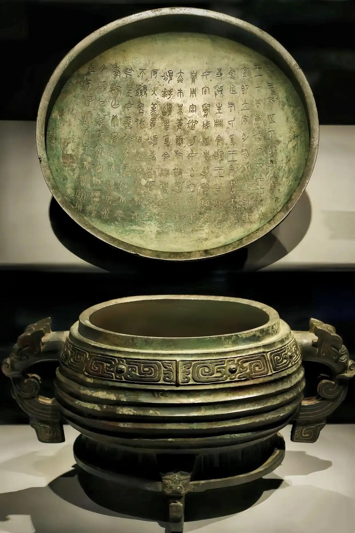 西周,高30.1厘米,口径24.2厘米。隆盖、圆腹、圈足,双耳造型别具一格,状如一变形龙首口吐祥云,双耳下的垂珥与圈足下的三小足形状相若,相映成趣。纹饰以窃曲纹为主纹,搭配使用瓦纹和垂鳞纹,繁简呼应,疏密有致。铭文篆刻工整秀丽,典雅规范。