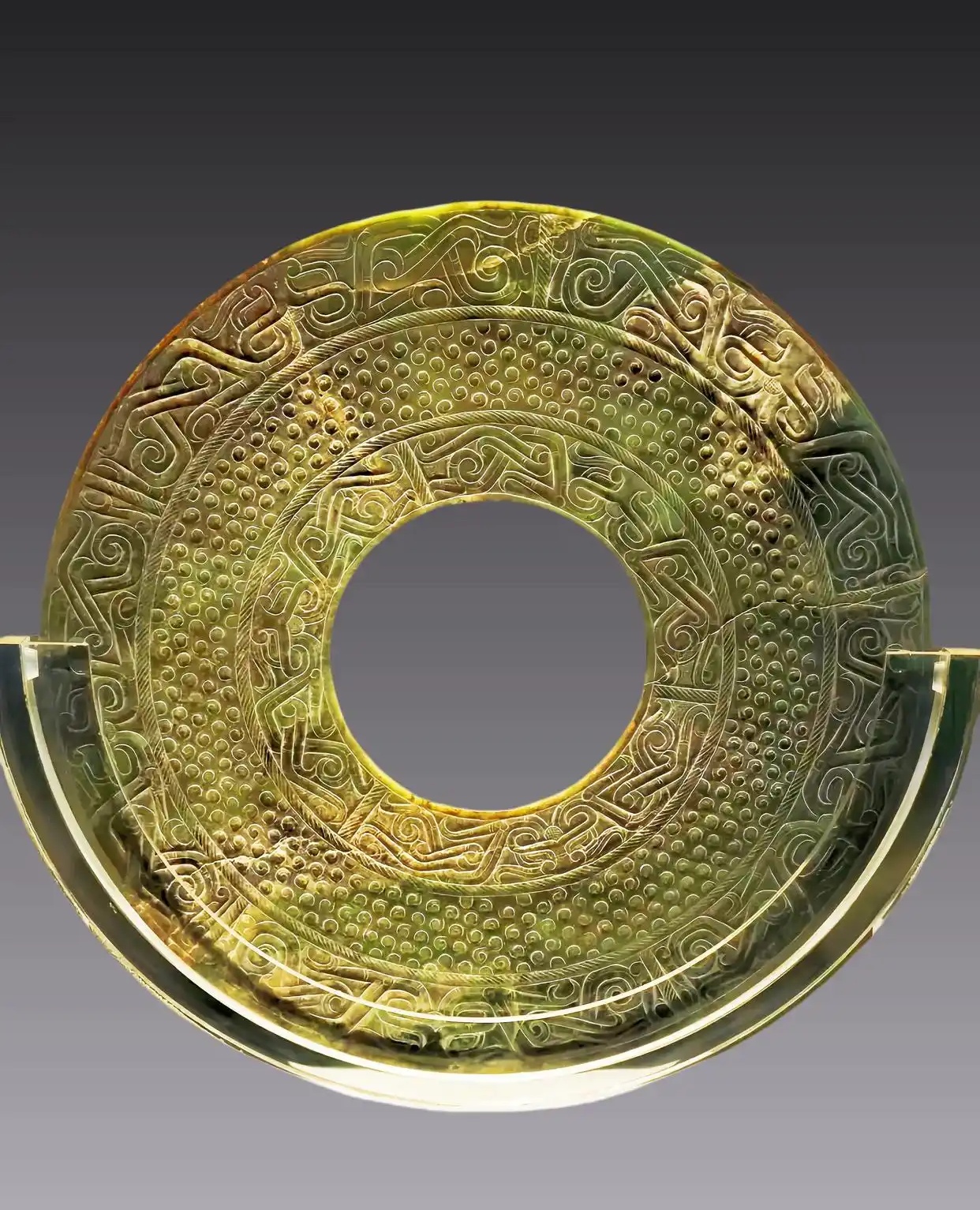 内层为合首双身龙纹,其间以三道绹索纹相隔成三组。外层为五组合首双身龙纹,每组龙尾两两相交,纹饰布局紧密匀称,繁缛精美,线条流畅,属战国玉璧中的精品,也是战国玉璧中形制最大的一件。鲁国大玉壁也是山东博物馆的标志性藏品,出土于曲阜鲁国故城乙组52号墓出土。
