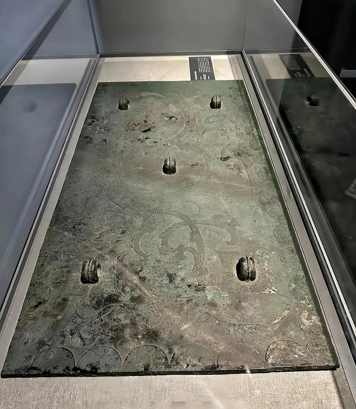 齐王墓青铜方镜,西汉青铜器。中国首批禁止出国(境)展览文物。1980年山东淄博大武公社窝托村南古墓五号陪葬坑出土,收藏于山东省淄博博物馆。齐王墓青铜方镜是西汉诸侯王墓出土文物。镜长115.1厘米,宽57.5厘米,重56.5公斤,是国内最大的铜镜。
