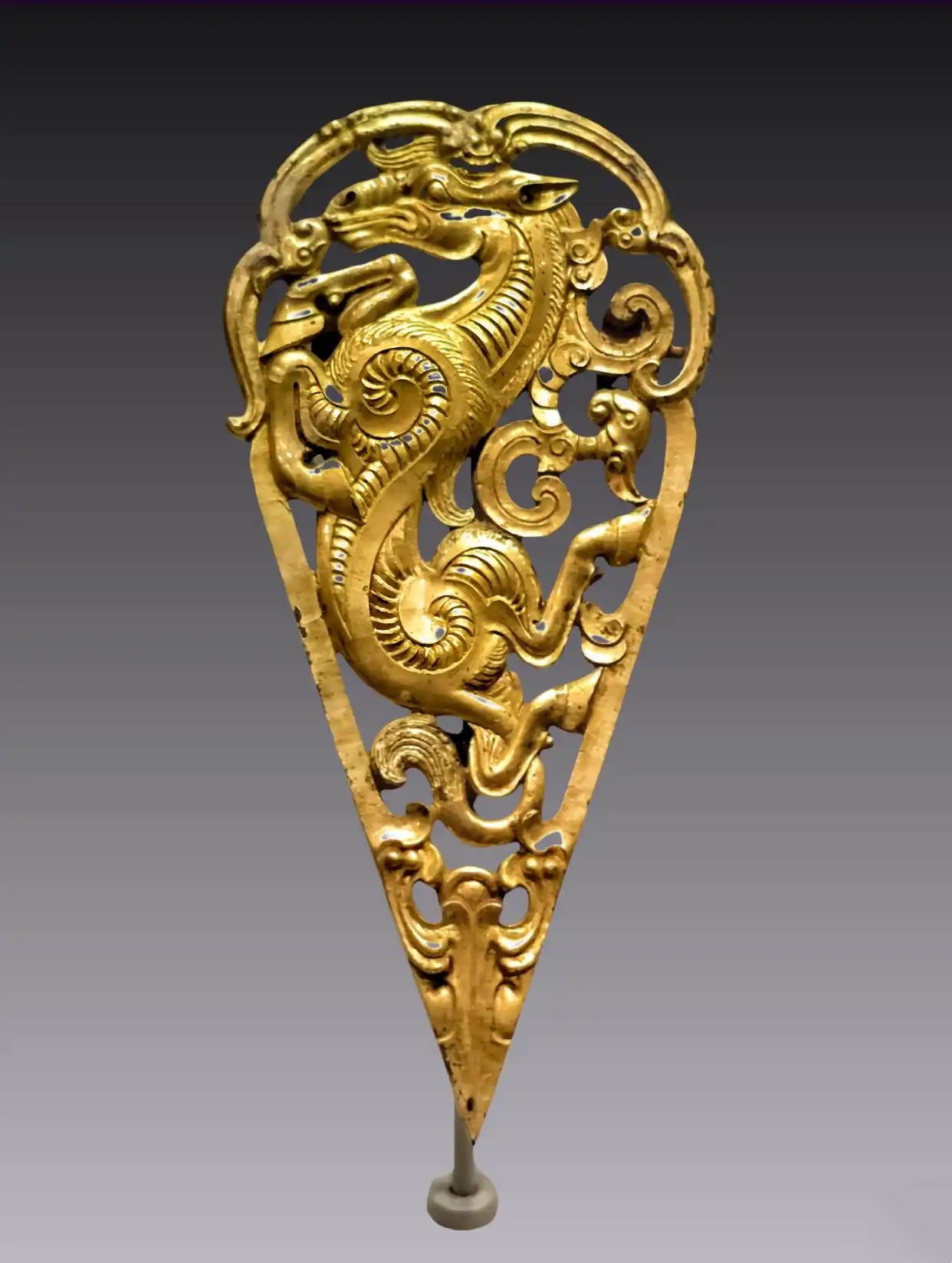 为汉代马具中用于装饰马额的饰件,其制作精美、工艺复杂,兼具实用与象征意义。这件当卢通体鎏金,呈叶片状,上端微弧,下部呈锥形,采用镂空浮雕工艺精心打造。主体为一匹卷曲呈反S形的骏马,马头上扬,前蹄腾空,后蹄反卷,马尾自两后腿间穿过,四周饰以流动的云纹,构图均衡且富有动感。金色鎏层与青铜的对比更添视觉效果。该器物不仅展示了汉代青铜铸造技术的精湛,还蕴含了汉代社会对马匹的崇拜与升仙观念。