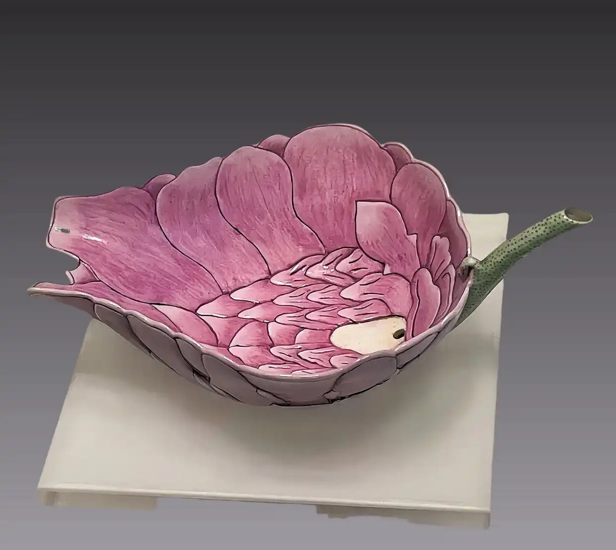 光绪粉彩荷花式秋操纪念杯,简称秋操杯,是光绪年间为纪念清军秋季操练而特制的纪念杯,烧制于清代光绪年间,属于粉彩瓷器,为清宫御用瓷器。秋操杯大约烧制了三千多个,国内外博物馆及私人收藏均为常见。 秋操杯采用荷花的形式,花蕊为器底,花瓣构成器身,器柄是花梗。杯身花瓣粉色下深上浅渐变,纹理清晰,釉色娇嫩,器柄为荷梗状,绿色釉彩,有小黑点模拟小刺,中空管状从梗端直通花蕊内。