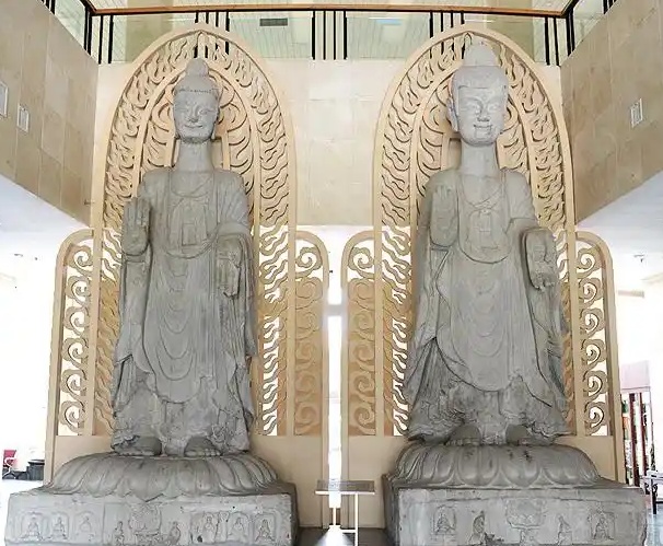 北魏石佛造像高570厘米、腹围385厘米、底径286×216厘米、底高100厘米 。两尊佛像造型基本相同,头作高肉髻,是道行高深的象征。这两尊佛像面型削瘦适中,深目高鼻,面带微笑,内着僧祇支,束带结于胸前下垂,外着褒衣博带式正披,衣纹断面呈“V”字形,赤足立于莲花座上,莲花瓣呈尖头状,下面还有方形须弥座。两尊佛像的手势,都是右手上扬,施无畏印,表示佛无所畏惧、庇护众生;左手下垂,掌心向外,施与愿印,表示佛满足众生的愿望,普度众生。作为我国博物馆室内陈列古代石造像,“双丈八佛”可为体量最大,且同殿两佛并立,皆为北魏圆雕,为世所仅存。是魏晋南北朝时期佛教造像艺术的杰出之作,为青岛市博物馆镇馆之宝之一,对研究北魏时期国家的社会政治、宗教和石雕艺术史以及山东历史文化发展等,都具有重要的价值。