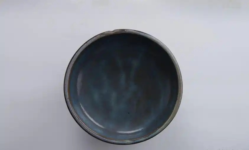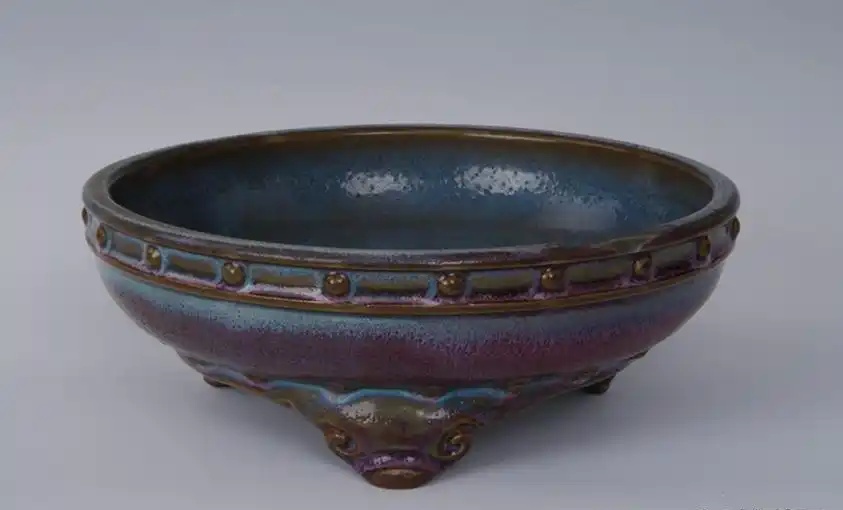 口径23.8厘米、底径17.5厘米、高9.1厘米 。此钧窑鼓式瓷洗为1962年青岛市文物商店在山东乳山收购,1965年12月27日,入藏青岛市博物馆。洗直口,成鼓式,浅弧壁。口沿延边凸起弦纹两周,外壁口沿下和近底部饰有两周等距离的乳钉纹,上周二十个,下周十八个。胎体厚而匀称,釉层肥厚滋润,通体内外施釉,洗的外壁釉层肥厚呈玫瑰紫色,器内为天蓝色釉,有蚯蚓走泥纹及桔皮纹。洗平底,底釉敷涂褐色护胎釉,斑驳古拙与莹润釉光对比鲜明,三个兽面足承托洗的主体,底的一侧清晰可见刻有“一”的字款,笔道遒劲,荡漾出独特的时代气息,是典型的宋代钧窑御用贡瓷的代表作品。此钧窑鼓式洗口沿微残,底部有裂纹。