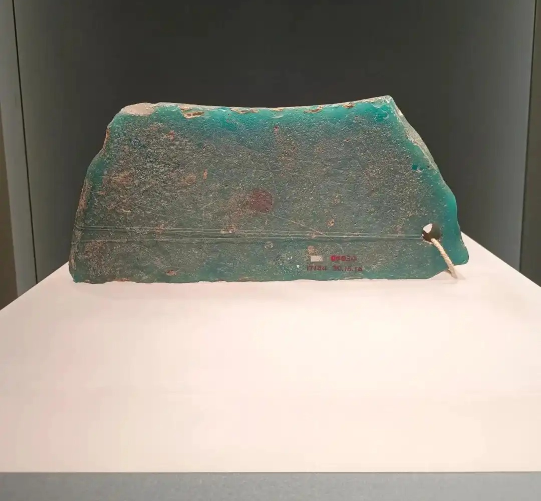 玻璃磬,现藏于青岛市博物馆。 战国时期,公元前476-前221年。发掘于即墨古城。古代玻璃制乐器,长33厘米、宽14.5厘米、高3.5厘米。呈不规则长方形,天蓝色。一端钻有一马蹄孔,可系绳悬挂。通体光素无纹,一面有土沁。