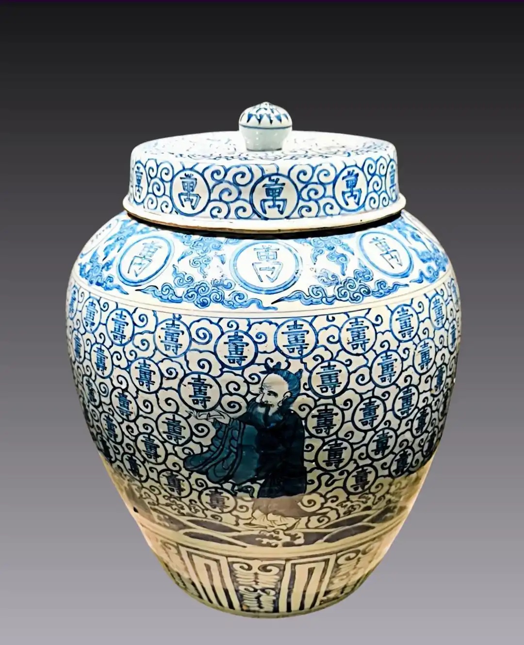 罐身以青花绘制人物图案及万寿字纹,构图丰富,青花色泽鲜艳,人物形象生动,展示了明代嘉靖时期高超的青花瓷器制作工艺和艺术水平,对于研究明代瓷器文化和社会风貌具有重要价值。