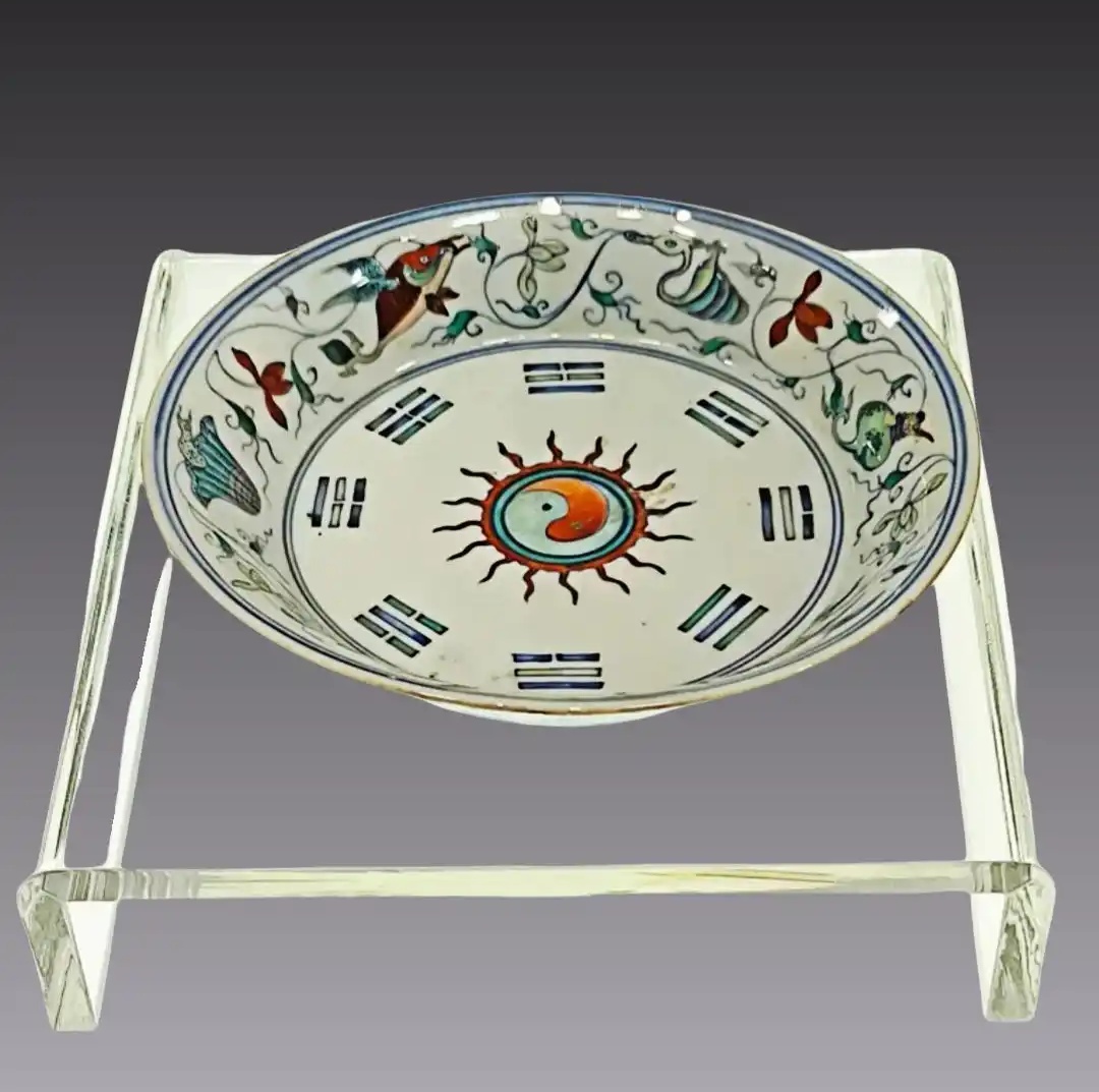 盘上以斗彩技法绘制八卦图案,色彩鲜艳,绘制精细,体现了康熙时期斗彩瓷器的高超制作水平,八卦纹的运用也反映了当时的文化和宗教内涵,是清代瓷器中的精品3。