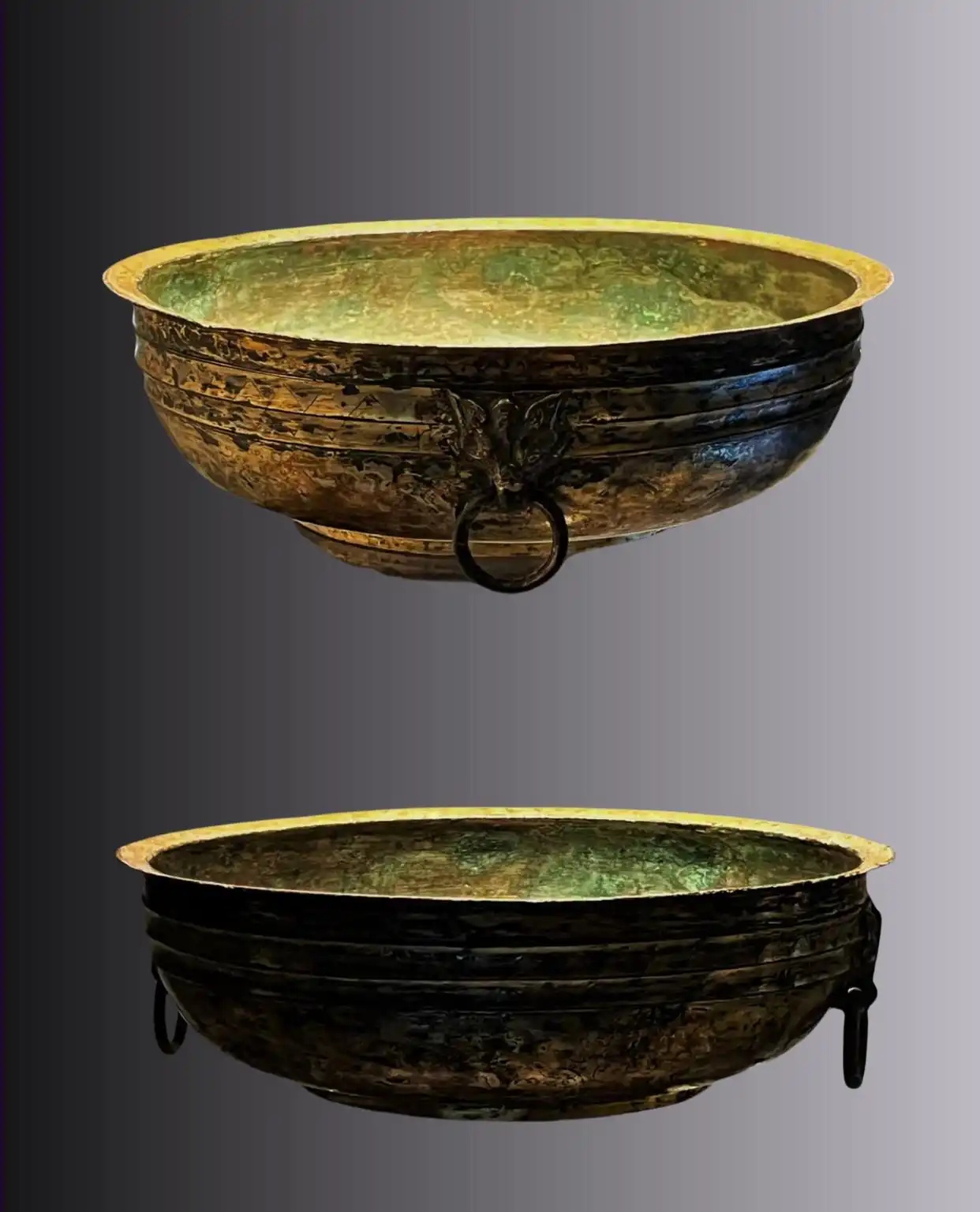 2009年寿县寿春镇计划生育服务中心工地砖室墓出土,该器物青铜质地,通体鎏金银,腹部有纤细流畅的针刻神兽、神乌、祥云图案,底部圈足内侧錾刻有汉隶50字铭文款:前两句为“元和二年,蜀郡西工造乘舆黄白涂舟”,标明了器物为 “蜀郡西工”工官所造,是供奉宫廷使用的“乘與”产品,器物制作于东汉早期公元85年。