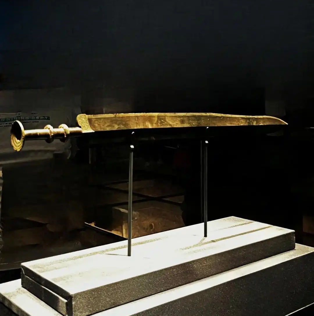 此剑的主人是越王勾践的儿子,因为剑柄刻了他的名字,者[zhū]旨[jī]→越王的氏、於[yú]睗[shì]→越王的名,经各方考证已经确认,越王者旨於睗就是《史记》记载的越王勾践之子鼫[shí]与。该剑一共铸了至少有九把,浙江博物馆现存一把,系辗转高价从境外收购的。至于这把怎么在寿州出现,据说是当初勾践的儿子送给当时蔡国蔡侯君的。