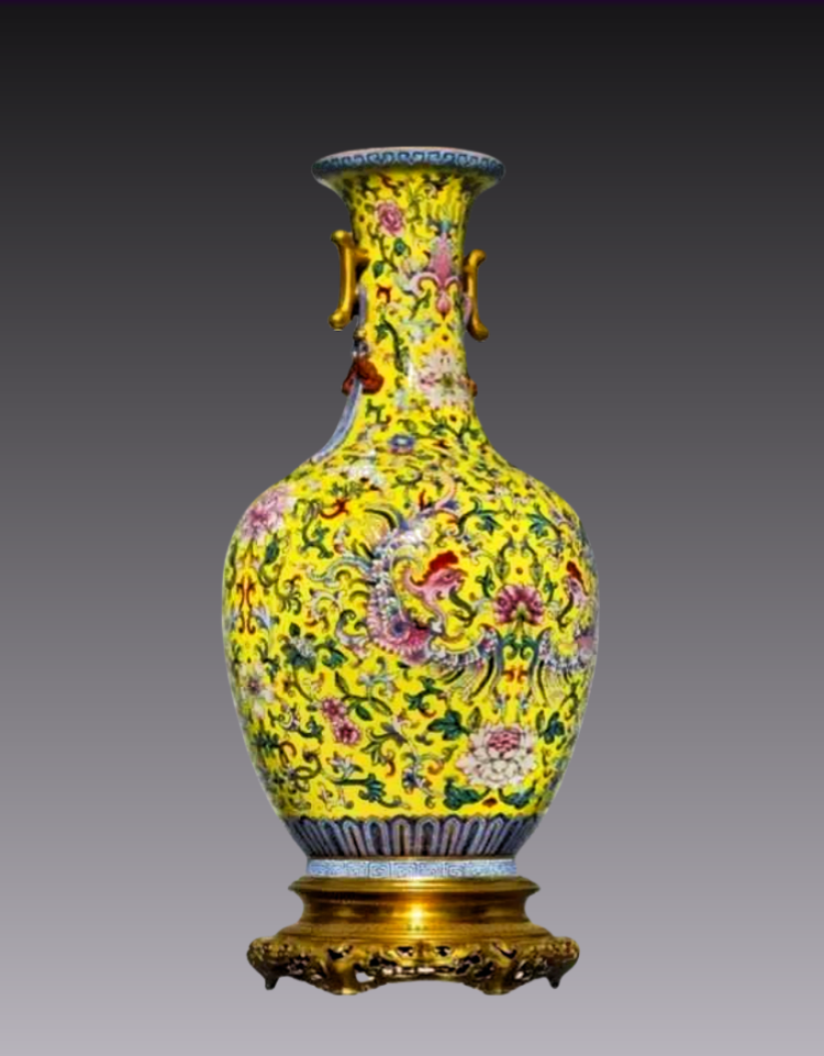 12、乾隆御赏黄地洋彩夔凤观音瓶