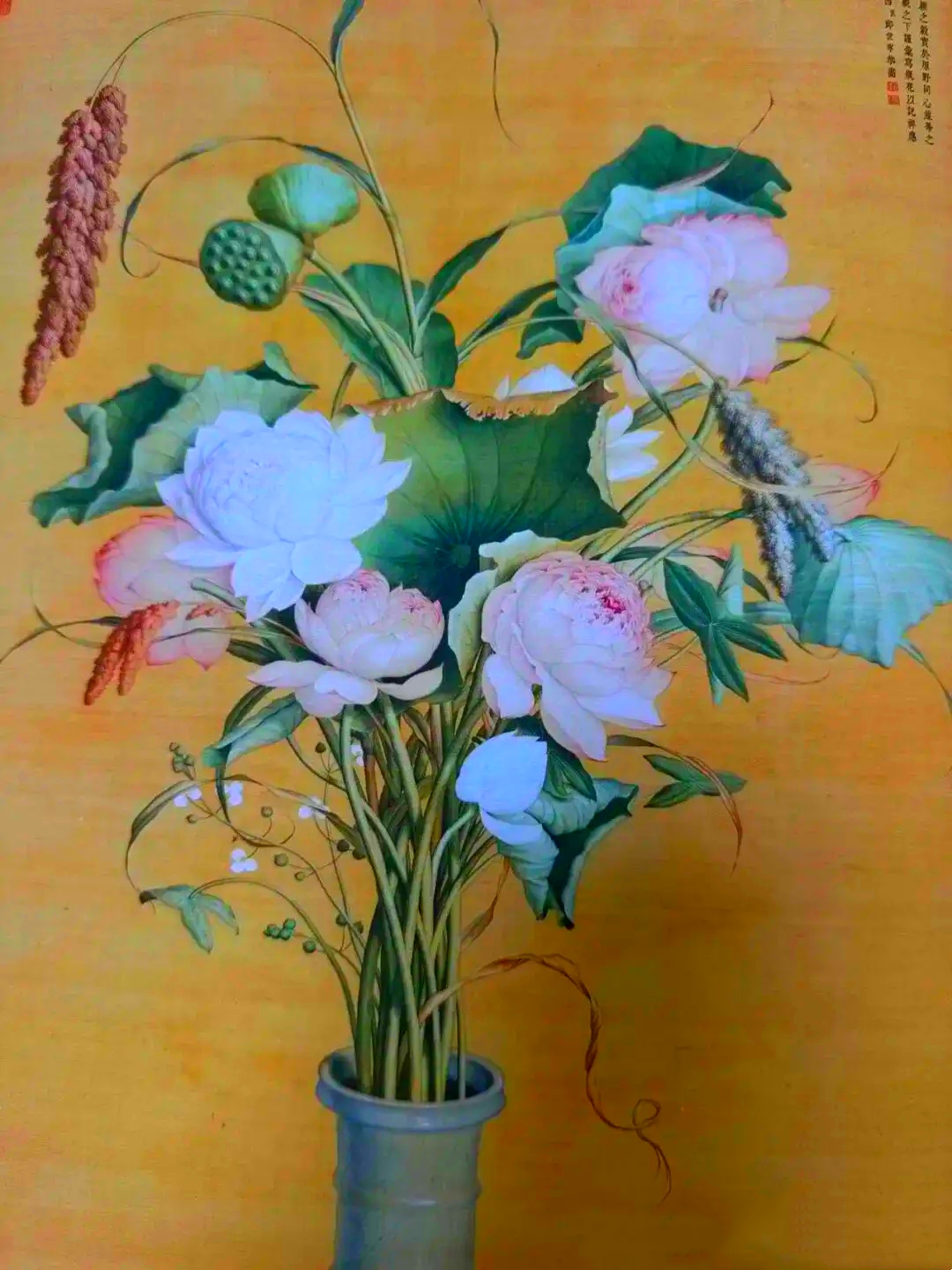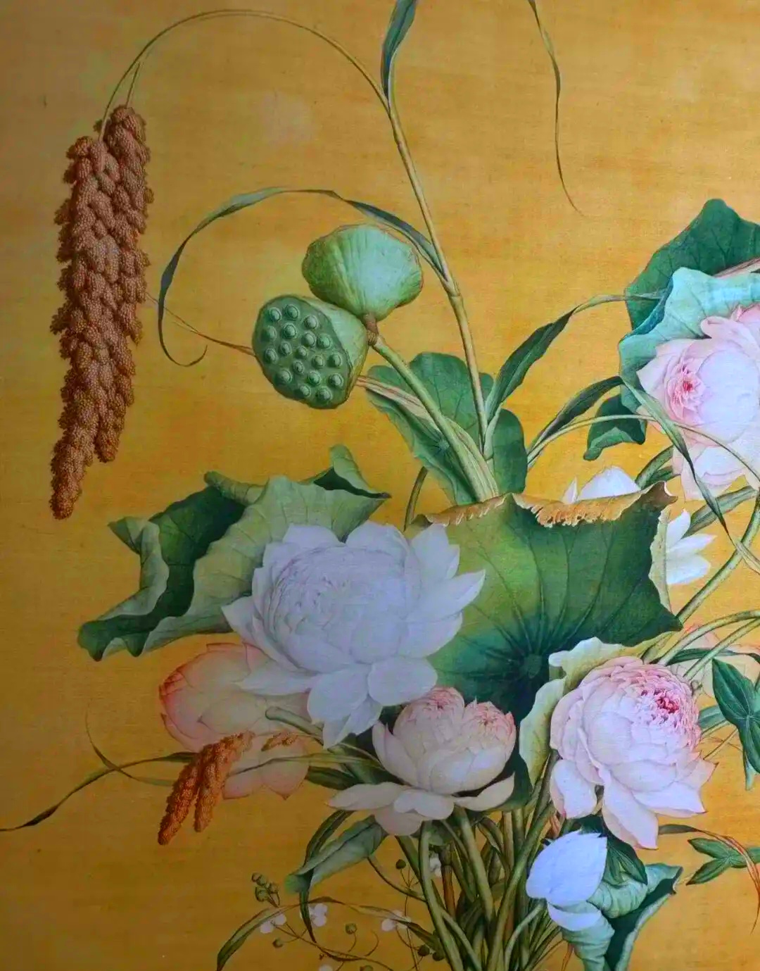 画面里,青瓷瓶静静伫立,瓶中并蒂莲或含苞或盛放,双穗粟籽粒饱满,每一抹色彩都藏着东方审美,而瓶与的高光又透着西方写实的精妙----这就是郎世宁的《聚瑞图》
