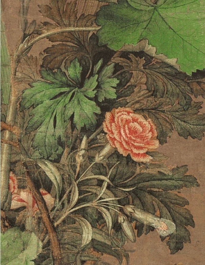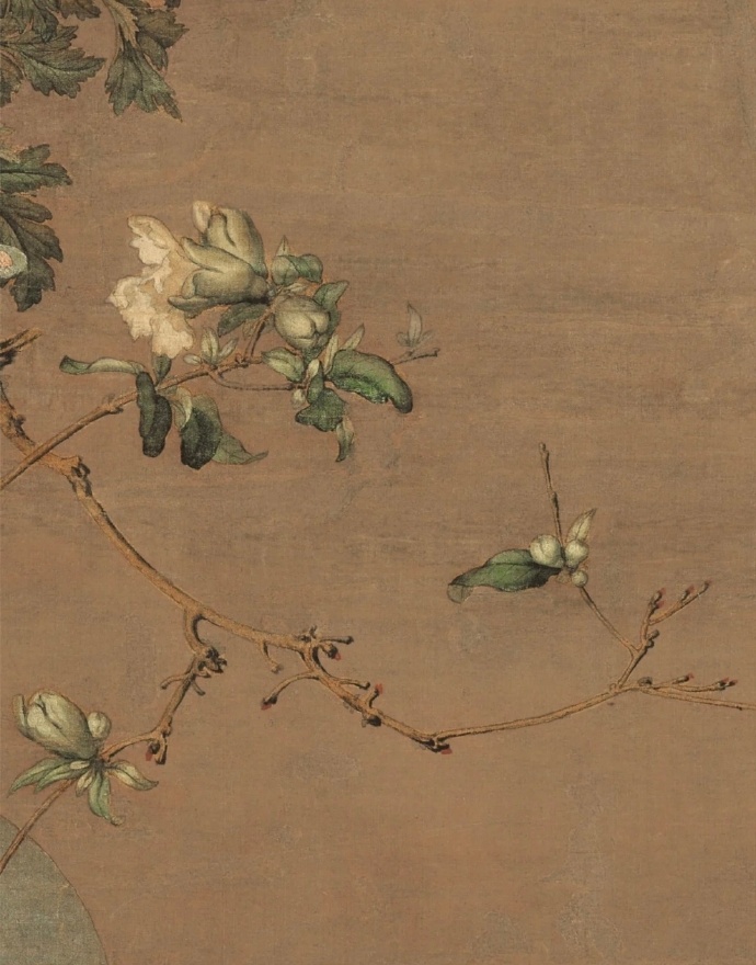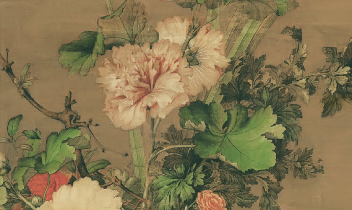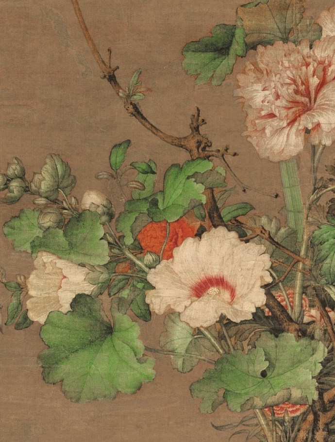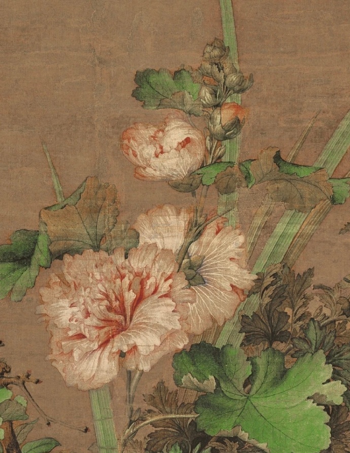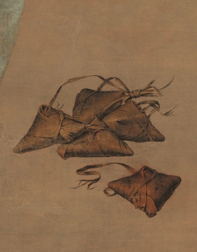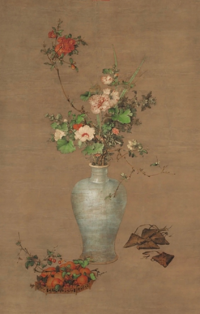 所绘清瓷高瓶中插着蒲草叶、石榴花和蜀葵花,花开鲜艳,品种繁多而不散乱;回字型托盘里盛有李子和樱桃,几个粽子散落瓷瓶的另一旁,节日气氛浓烈。 图中的粽子、蒲草等物暗示此画是为中国的传统节日——端午节而绘制的。
