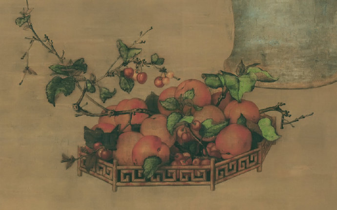 《午瑞图》是一幅近似于欧洲静物画的作品,青瓷瓶内插着蒲草叶、石榴花和蜀葵花,托盘里盛有李子和樱桃,几个粽子散落一旁。图中的粽子、蒲草等物暗示此画是为中国的传统节日——端午节而绘制的。就构图而言,画中物品聚散有致,呈正三角形布局,给人的视觉以稳定感。而绘制方法则采用色彩深浅及光影明暗的变化展示花叶、水果和瓷瓶的立体感,尤其是瓷瓶肩部见于欧洲绘画而中国画绝无的“高光”手法,能令观者清晰地体会到西方油画的技巧。虽然画面没有落年款,但根据清内务府造办处的档案记载,此图应作于雍正十年(1732年),属郎世宁在中国的早期作品。