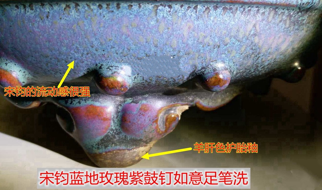 宋钧与仿品的区别,关键点一是釉料为矿料、玛瑙,釉里有金点和小颗粒。二是柴窑烧,而不是煤窑、气窑。柴窑烧,流纹、卷云纹有立体感,不可仿,成本高的吓人。煤窑烧的,火急火大,釉面流动性强而流纹僵硬,气泡小,呈橘皮面。气窑时间更短,无气泡,呈平面。