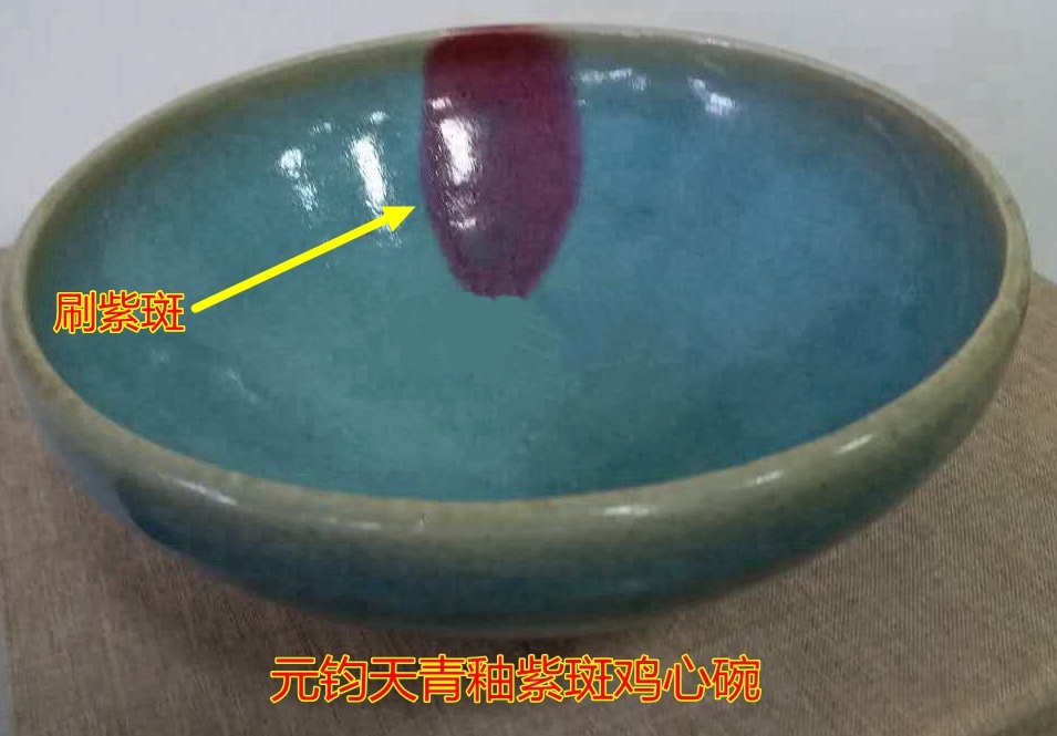 1.釉色:元钧为煤窑烧造。瓷釉色天青或天蓝,部分有红色的铜红釉斑块。元钧红釉班为人工涂刷所至,刷痕明显。釉色鲜艳,