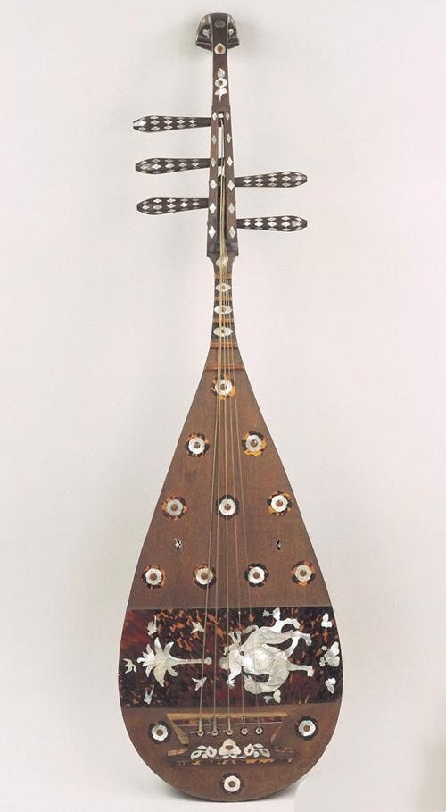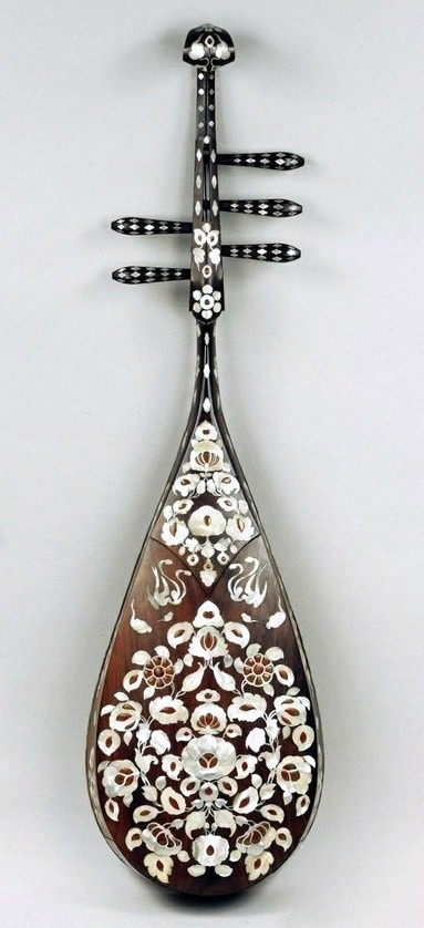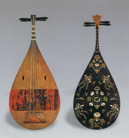 螺钿紫檀五弦琵琶 唐 长108.1cm 最大腹宽30.7cm 日本奈良正仓院藏 系南北朝时自西域传入中原,至隋