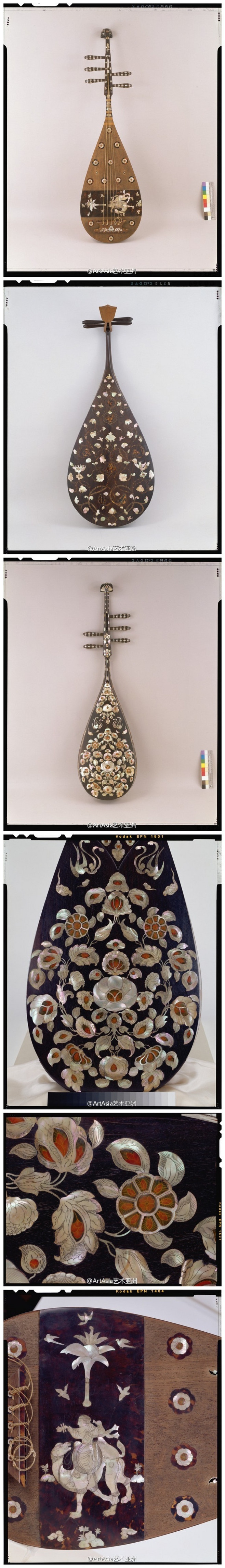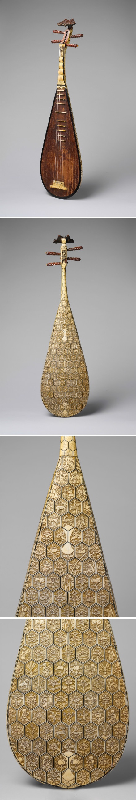 【明代琵琶】“琵琶”作为外来乐器,南北朝时由印度经龟兹传入内地,其外形也改变颇多。#美国大都会博物馆#藏“明代琵琶”形制已与现代琵琶无异,但背面十分惊艳,由110余片六角形象牙薄片镶嵌,上面分别刻有道、儒、佛的图案。嘈嘈切切错杂弹,大珠小珠落玉盘。