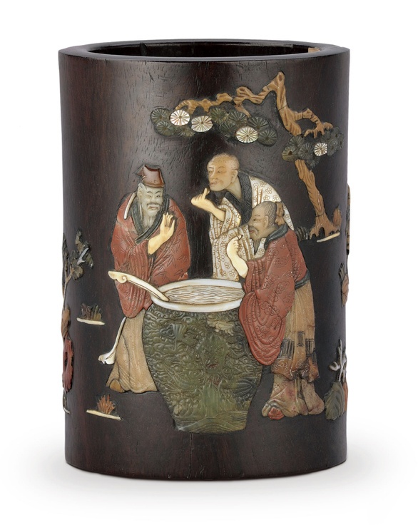 笔筒圆筒状,平底,口径与底径一致。简身以玉石、螺钿、寿山石、象牙、玛瑙等材料,百宝嵌人物故事图。笔筒底部镶嵌有螺钿刻“乾隆御制”款。此笔筒装饰复杂,工艺精湛,别具一格。