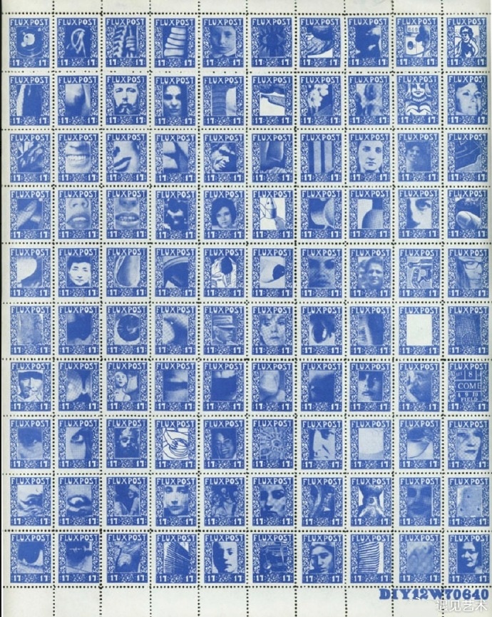 《Fluxpost/17-17》(1964 年):鲍勃・沃茨(Robert Watts)是激浪派的关键人物,其作品以独特的创意和对艺术与生活边界的突破而著称。沃茨设计的邮票作品,包含 100 张不同图像的邮票,边框设计独特,图像融合了抽象与具象元素,来源广泛,如摄影、绘画等。该作品是其邮票系列的代表作,体现了激浪派将艺术融入日常物品的理念。