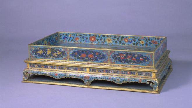 明宣德掐丝珐琅狮戏球纹双陆棋盘:同样为宣德朝“御用监”制作,长框内刑字锦地上饰七狮戏球纹,胎体厚重,造型规矩,装饰精美,是明代御用监所造的重器之一。