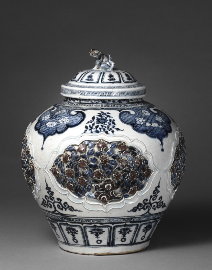 这件元代瓷罐结合了三种装饰技艺:釉下青花、釉里红与开光镂雕。罐身绘以青花缠枝与山石花卉,开光内部镂刻并贴塑图案,再施以釉里红点缀,盖钮为动物造型,整体层次丰富、色彩对比强烈。