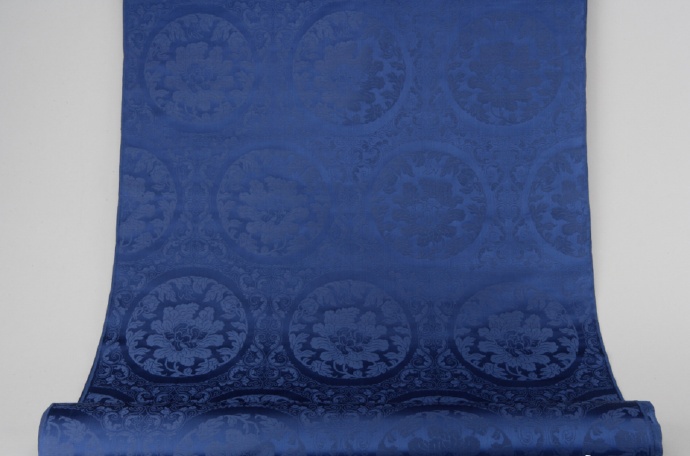 蓝色蔓草团牡丹纹暗花缎,清乾隆时期织锦面料。以深蓝色为地,织有蔓草与团牡丹暗纹,图案隐现于缎面之中,层次丰富,质感典雅。牡丹象征富贵,蔓草寓意绵延不断,此织物常用于宫廷服饰或陈设,体现乾隆时期宫廷织造工艺的高超与审美的精致华丽