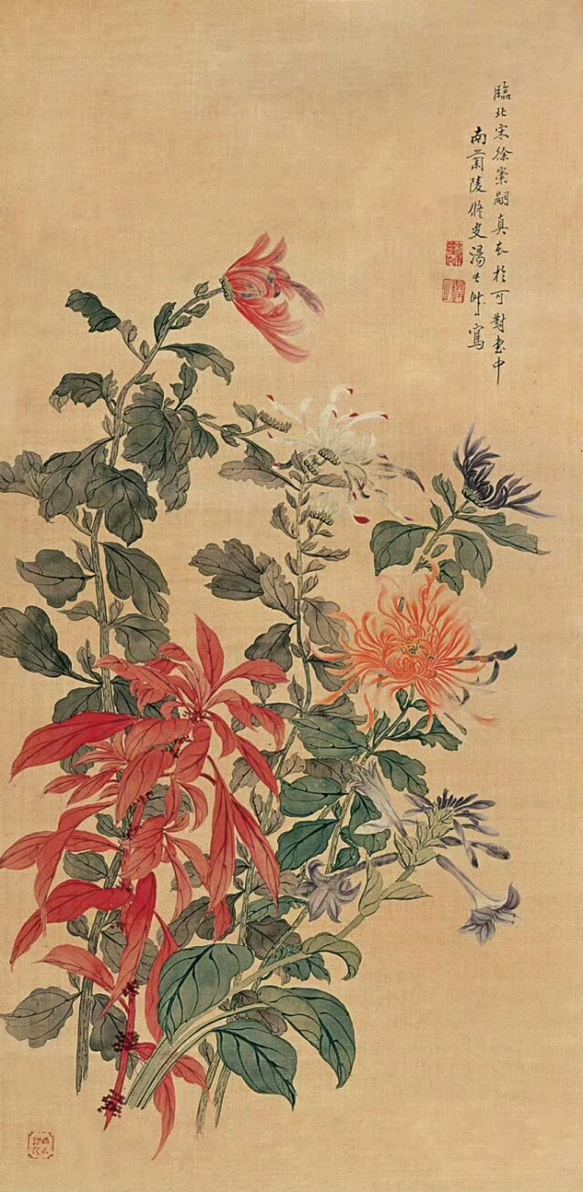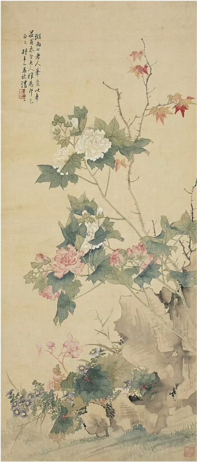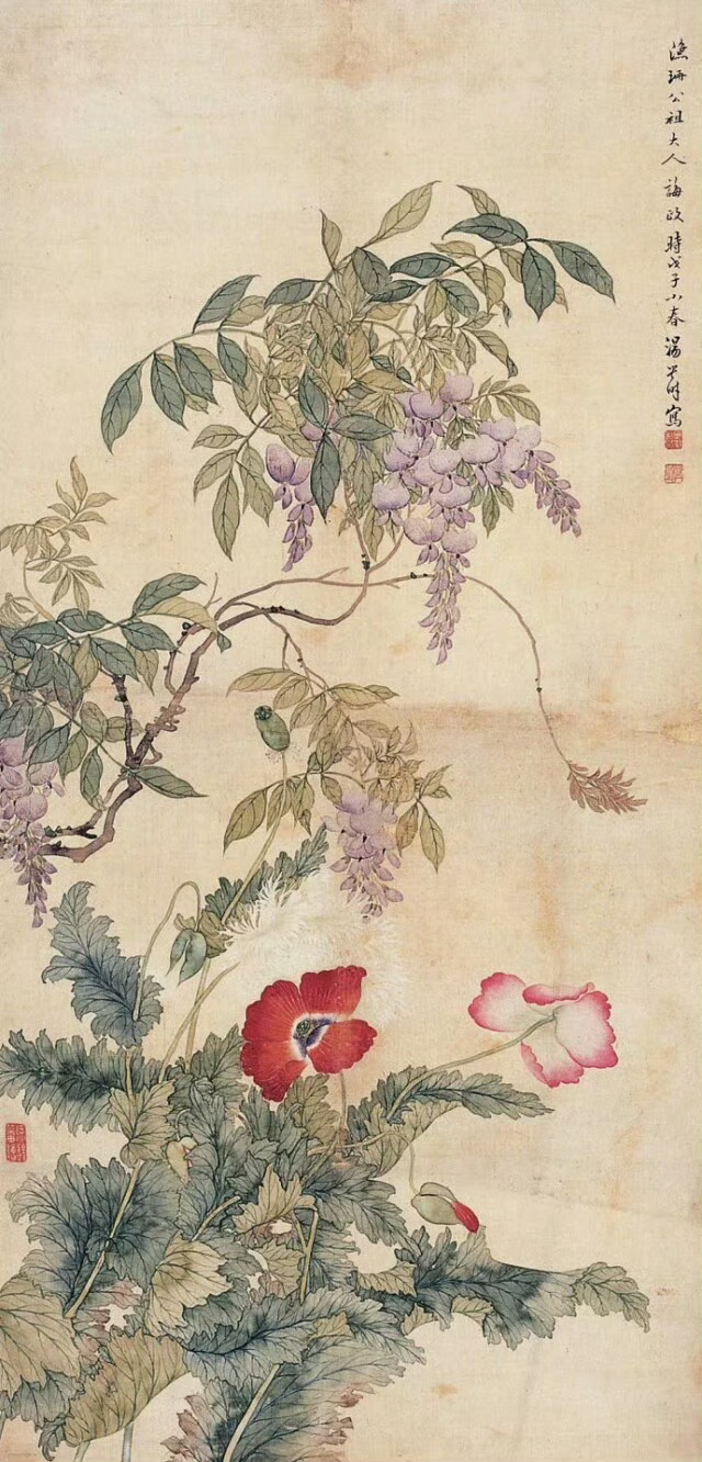 汤世澍(1831—1903)字润之,晚号修叟,别号春雨楼主。武进(今江苏常州)人。汤贻汾曾孙。国子监生,家学渊源,工花卉,鲜丽无比,书工米芾,题识精美,比之古人三绝。年逾古稀犹点笔不倦。光绪二十年(1894)进所绘百花屏九帧,为慈禧太后所赏。卒年七十二。