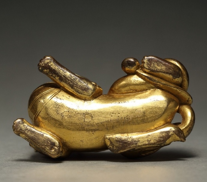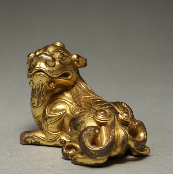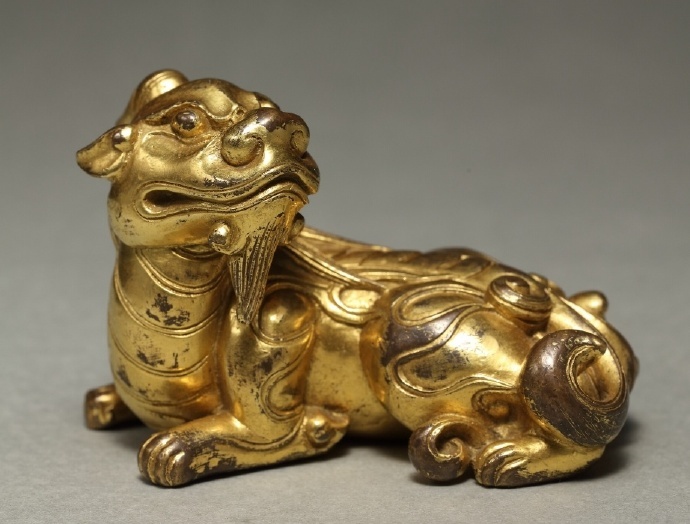 铜鎏金卧兽,通体鎏金,首似狮形,双目圆睁,凝视前方,两眉突起,并饰双角向后延伸,伏地匍匐,兽首回转,下颌前伸,尾卷曲服贴后侧,背脊隆起,两侧雕琢双翼。先民塑造神兽灵物,意在辟邪降福。