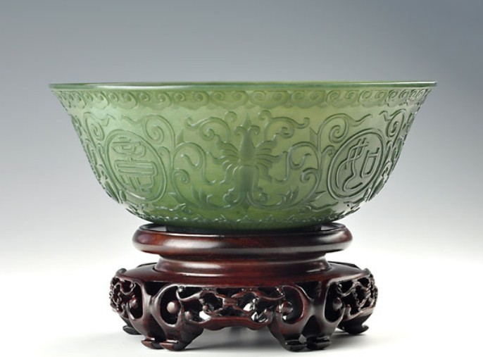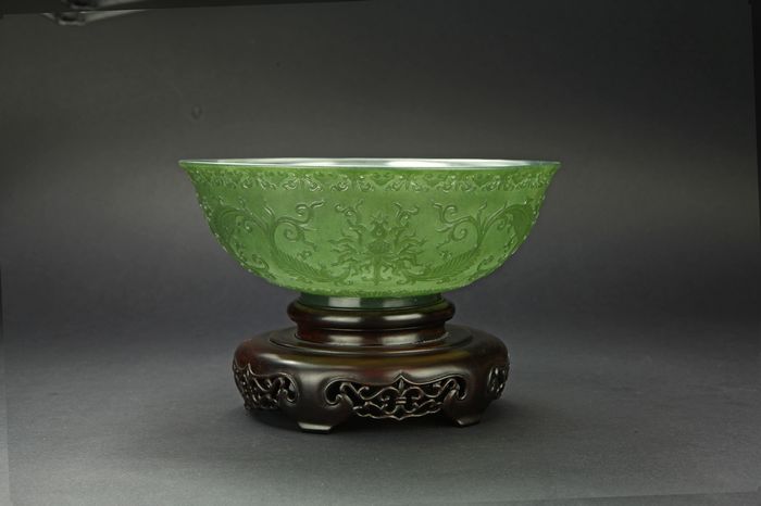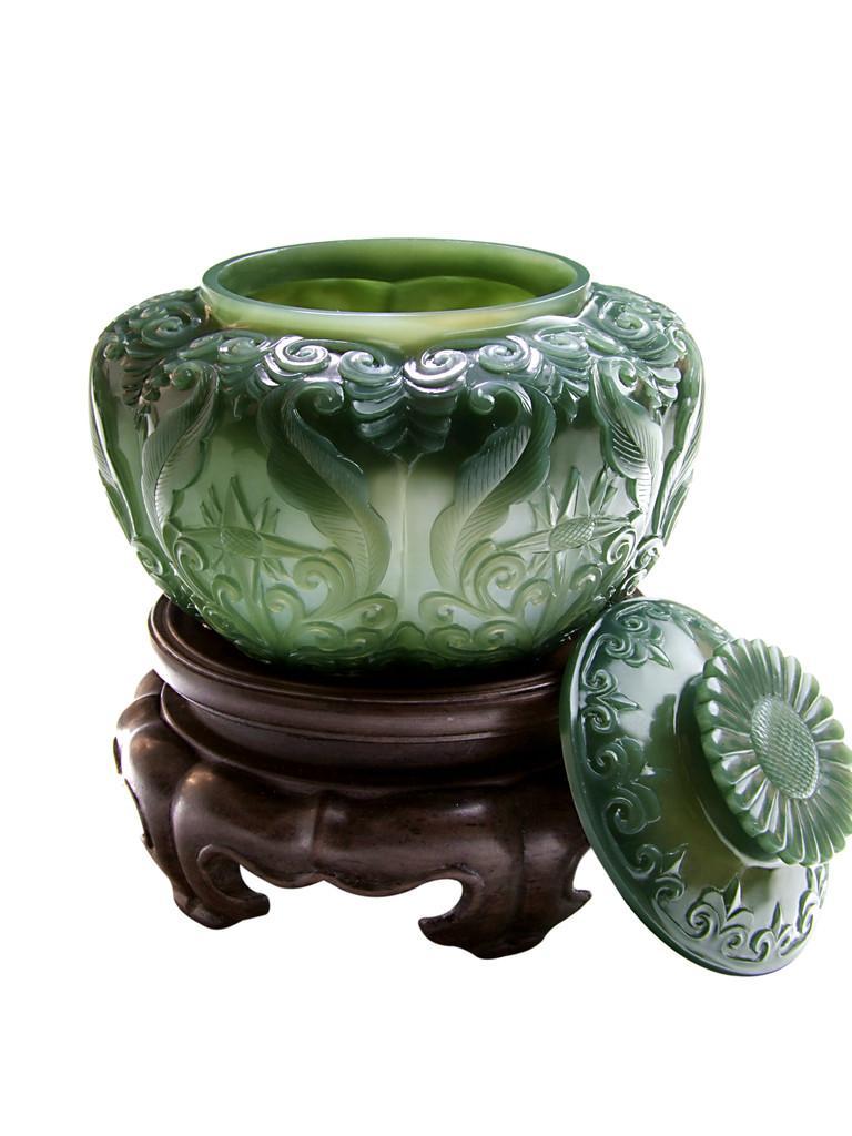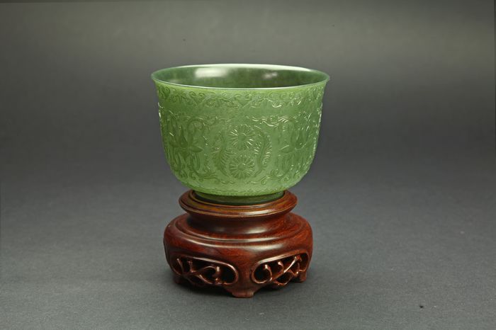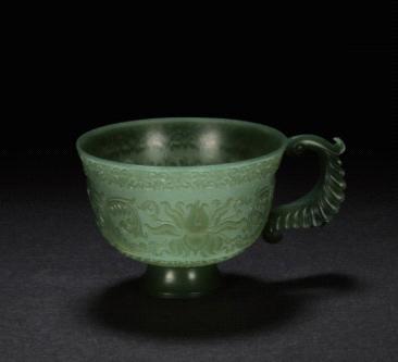 建国初 和田玉碧玉仿乾隆工痕都斯坦缠枝莲薄胎花卉