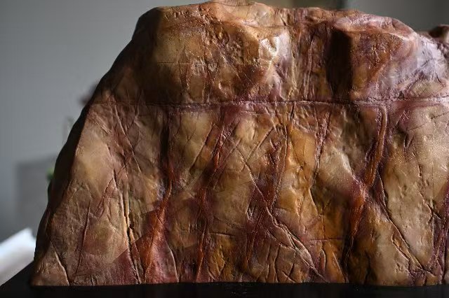 这方灵璧石彩磐屏风,气势非凡,宛如天成的艺术巨制。石体硕大厚重,展现出雄浑壮阔之姿。不同于常见的灰黑色灵璧石,它的色泽丰富而独特,以暖棕色为基调,夹杂着深浅不一的纹理,似大地的脉络,又似岁月晕染的色彩